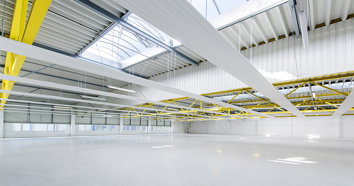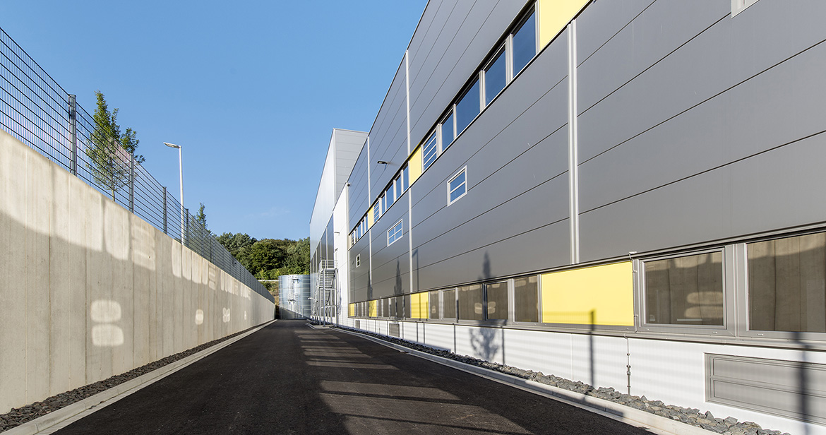 Das Bauvolumen umfasst ein Bürogebäude für Versand und Kommissionierung, sowie Räumlichkeiten für die Produktion und ein eindrucksvolles Hochregallager.